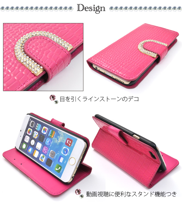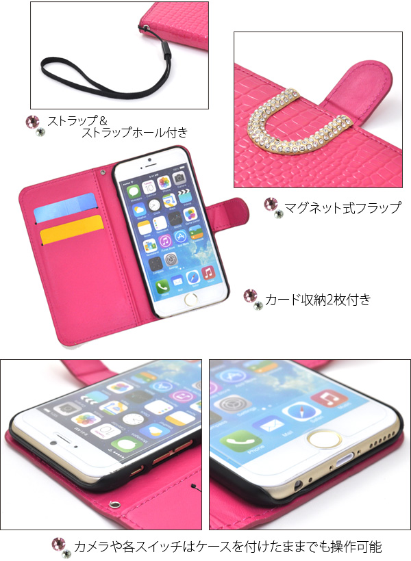 クロコダイルレザーデザインにデコをあしらった女性にピッタリのポーチケースです。 内側にはカード収納がついているので、定期やICカードなどを入れてお使いいただくと便利です♪ 開閉はマグネット式で、使い勝手の良い手帳型です。またストラップホールもついています。 衝撃やキズなどからiPhone6を守るのはもちもん、 カメラ、イヤホンや各種ボタンなどをケースに入れたまま操作可能です。 カラーはビビッドピンク、ホワイト、ブラックの3色からお選びいただけます。 ※iPhone6は付属しません。 ※ライセンス商品ではありません。 |