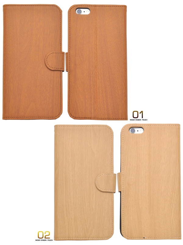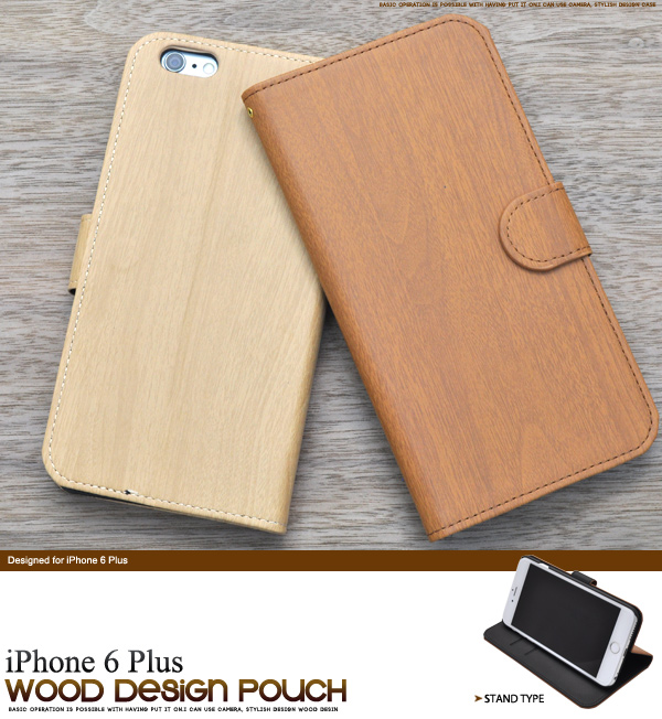 木目調のiPhone 6 Plus用スタンドケースポーチ。