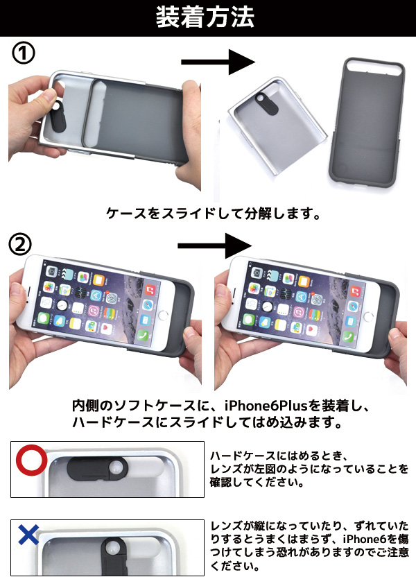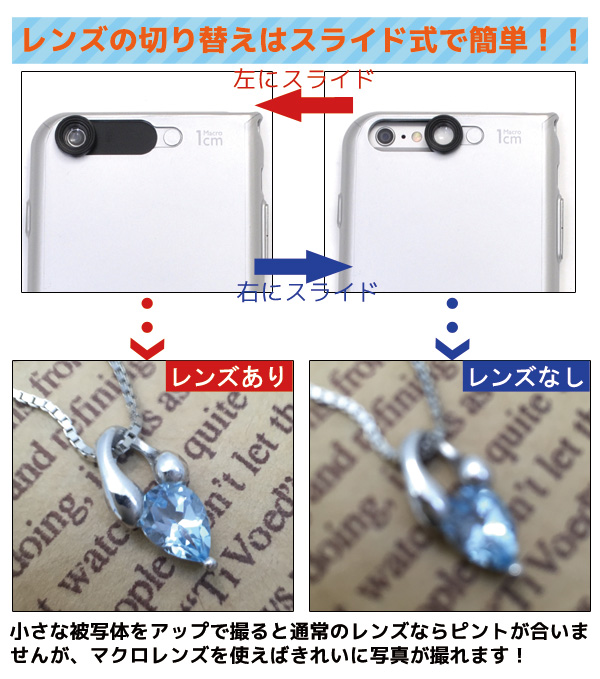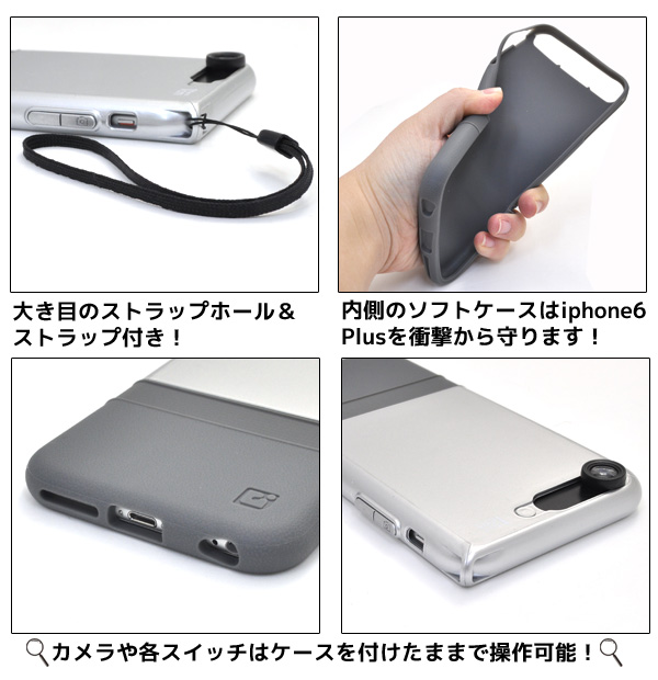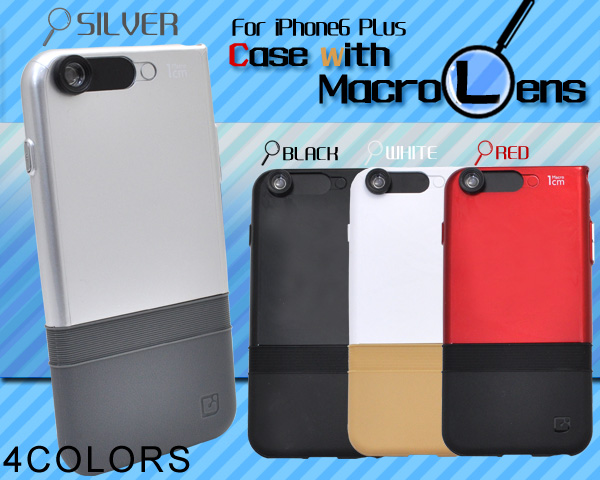 ■iPhone6Plusで一味違う写真が取れる!マクロレンズ付きケース 被写体に1cmまで寄れるマクロレンズ搭載! レンズをスライドするだけで簡単に切り替えが可能です! ■ハードケースとソフトケースの組み合わせで衝撃や 埃などからiPhone6Plusしっかり守ります! ■もちろん、装着したまま充電やヘッドフォンジャックなどの 接続、各種ボタンの操作も行えるようにデザインされています。 ストラップの通しやすい大き目のストラップホールに、落下防止に便利なストラップつきです! ■シルバー、ブラック、ホワイト、レッドの4色展開です。 ※iPhone 6 Plusは付属しません。 ※ライセンス商品ではありません。 |