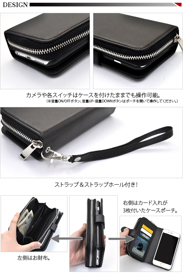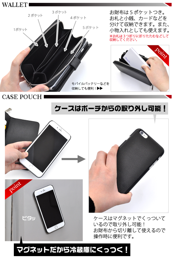 左側はお財布になっていて、右側はiPhone6 Plusが収納できます。 お財布側は5つのポケットでお札・カード・レシートなどたくさん入る仕様です。 チャックでしっかり閉めることができるので、大事なものを落とす心配もありません。 右側はiPhone6 Plus用ケースと、カード収納が3枚ついています。 ケースはマグネットで取り付けてありますので、取り外し化可能! 操作するときには取り外すことができます。 背面がマグネットなので冷蔵庫にはってレシピを見ながらお料理もできます。 またストラップホールとストラップがついています。 カラーは落ち着いた雰囲気のあるブラックをご用意しております。 ※iPhone6 Plusは付属しません。 ※ライセンス商品ではありません。 |