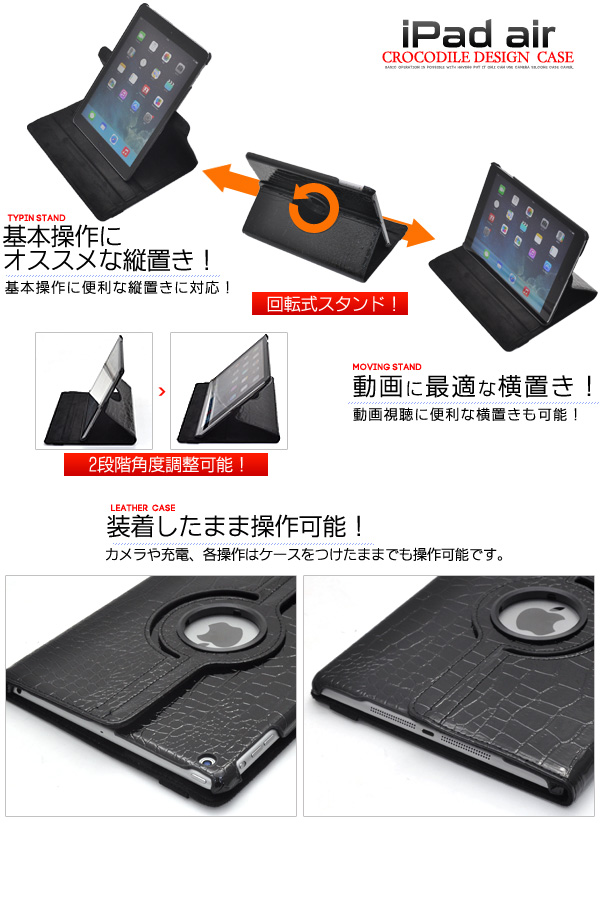 高級感あふれる、クロコダイルレザー調のiPad用ケース。 ボディだけでなく、タッチパネルも保護する手帳タイプです。 カメラや充電、各操作はケースをつけたままでも操作可能です。