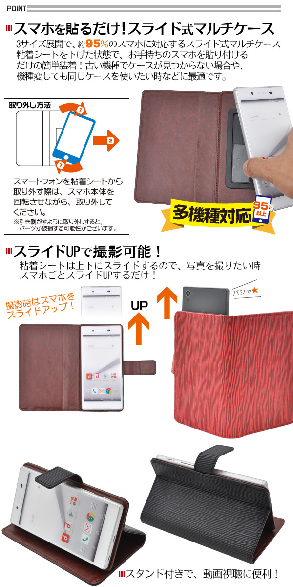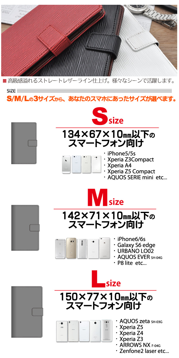| 対応機種 | 【Lサイズ】縦150×横77×厚み10mm以下のスマートフォン ・AQUOS zeta(SH-03G)・Xperia Z4 ・Xperia Z3・Xperia Z5 ・ARROWS NX(F-04G) ・Zenfone2 laserなど 【Mサイズ】縦142×横71×厚み10mm以下のスマートフォン ・iPhone6/6s ・Galaxy S6 edge ・URBANO LO02 ・AQUOS ever ・P8 liteなど 【Sサイズ】縦134×横67×厚み10mm以下のスマートフォン ・iPhone5/5s ・Xperia Z3Compact ・Xperia A4 ・AQUOS SERIE miniなど ※機種によってはカメラは使用できない場合があります。 |