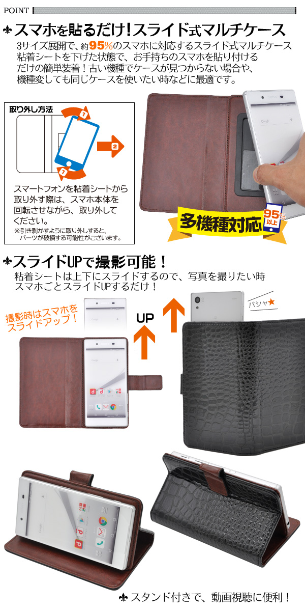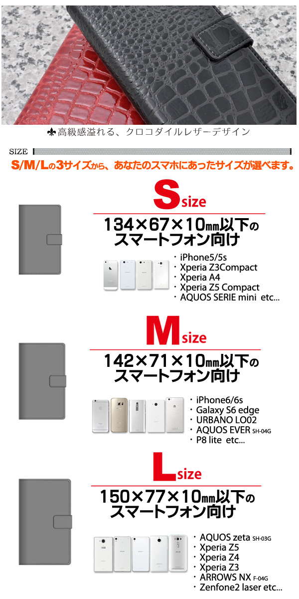 | 対応機種 | 【Lサイズ】縦150×横77×厚み10mm以下のスマートフォン ・AQUOS zeta(SH-03G)・Xperia Z4 ・Xperia Z3・Xperia Z5 ・ARROWS NX(F-04G) ・Zenfone2 laserなど 【Mサイズ】縦142×横71×厚み10mm以下のスマートフォン ・iPhone6/6s ・Galaxy S6 edge ・URBANO LO02 ・AQUOS ever ・P8 liteなど 【Sサイズ】縦134×横67×厚み10mm以下のスマートフォン ・iPhone5/5s ・Xperia Z3Compact ・Xperia A4 ・AQUOS SERIE miniなど ※機種によってはカメラは使用できない場合があります。 |