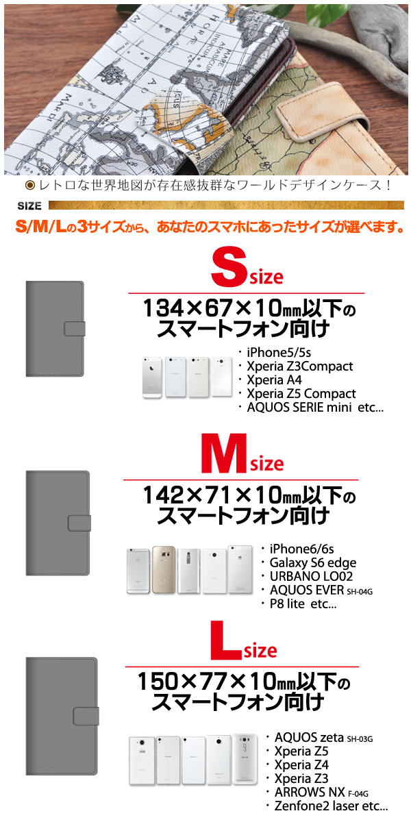 | 対応機種 | 【Lサイズ】縦150×横77×厚み10mm以下のスマートフォン ・AQUOS zeta(SH-03G)・Xperia Z4 ・Xperia Z3・Xperia Z5 ・ARROWS NX(F-04G) ・Zenfone2 laserなど 【Mサイズ】縦142×横71×厚み10mm以下のスマートフォン ・iPhone6/6s ・Galaxy S6 edge ・URBANO LO02 ・AQUOS ever ・P8 liteなど 【Sサイズ】縦134×横67×厚み10mm以下のスマートフォン ・iPhone5/5s ・Xperia Z3Compact ・Xperia A4 ・AQUOS SERIE miniなど ※機種によってはカメラは使用できない場合があります。 |