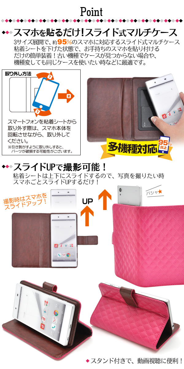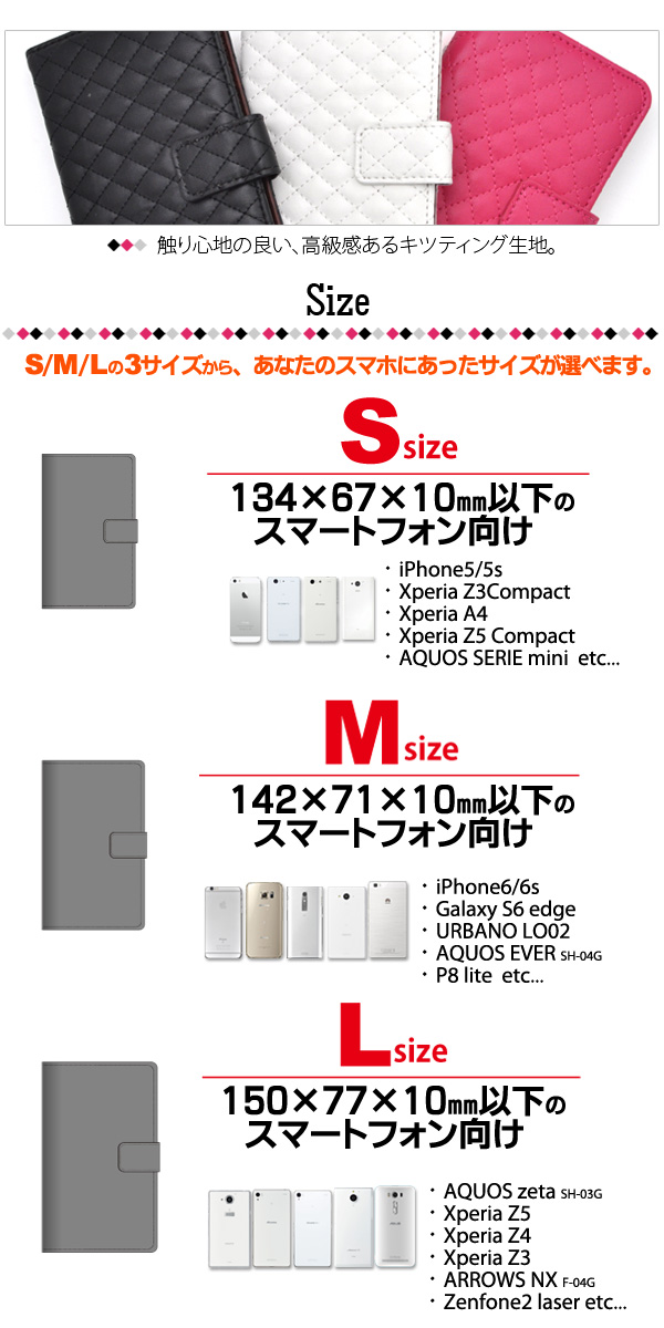 | 対応機種 | 【Lサイズ】縦150×横77×厚み10mm以下のスマートフォン ・AQUOS zeta(SH-03G)・Xperia Z4 ・Xperia Z3・Xperia Z5 ・ARROWS NX(F-04G) ・Zenfone2 laserなど 【Mサイズ】縦142×横71×厚み10mm以下のスマートフォン ・iPhone6/6s ・Galaxy S6 edge ・URBANO LO02・AQUOS ever ・P8 liteなど 【Sサイズ】縦134×横67×厚み10mm以下のスマートフォン ・iPhone5/5s ・Xperia Z3Compact ・Xperia A4 ・AQUOS SERIE miniなど ※機種によってはカメラは使用できない場合があります。 |