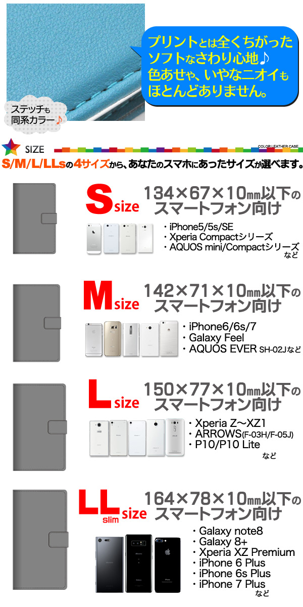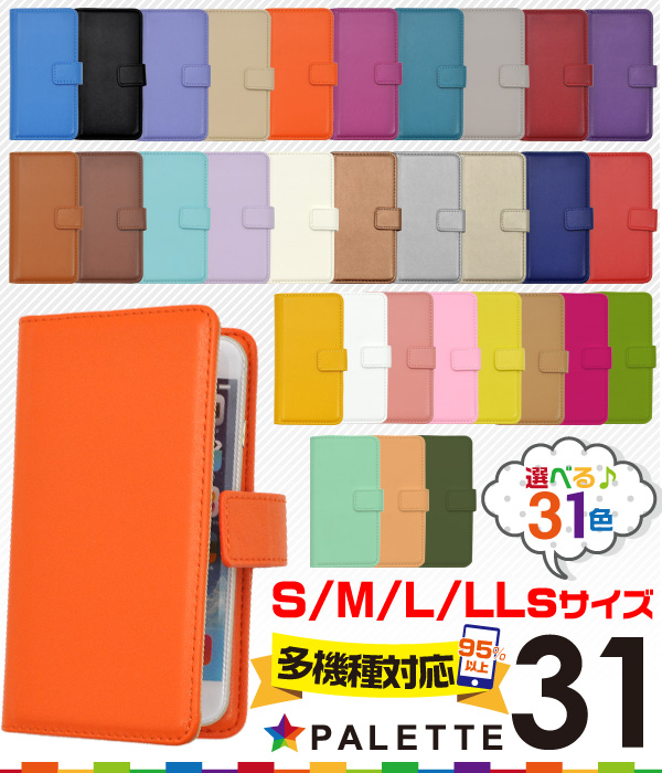 プリントとは全くちがった ソフトなさわり心地! 各種スマホ対応マルチタイプの31色カラーレザー手帳型ケース S/M/L/LLsサイズ |
