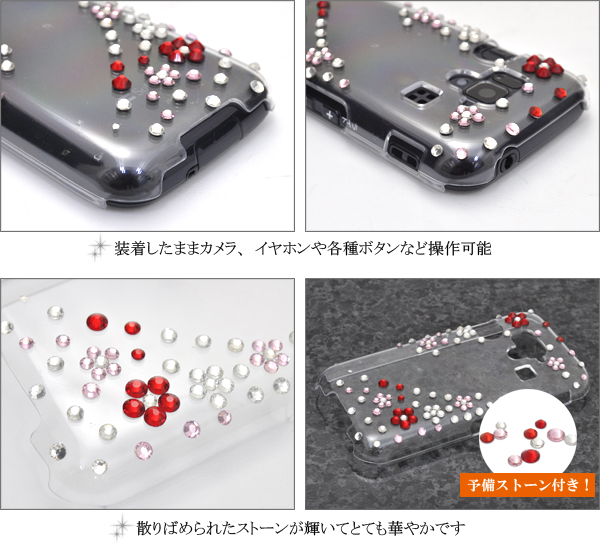 ストーンで配置されたお花が輝く、華やかなデコケースです。 もちろん、衝撃やキズ、埃などからシンプルスマホ 204SHをしっかりと守ります。 カメラ、イヤホンや各種ボタンなどをケースに入れたまま操作可能です。 ラインストーンが取れてしまった時に便利な、予備ストーン付きです。 2種類のデザインからお選びいただけます。 |