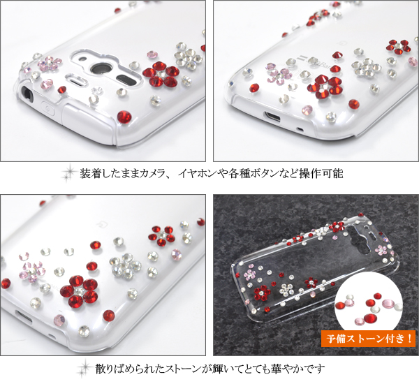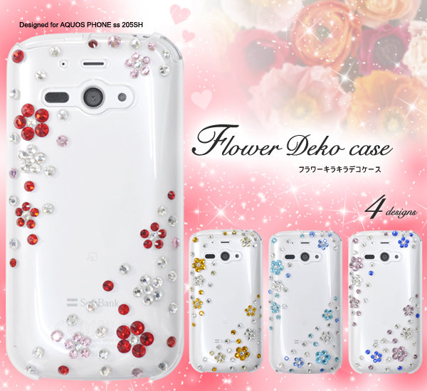 ストーンで配置されたお花が輝く、華やかなデコケースです。 もちろん、衝撃やキズ、埃などからAQUOS PHONE ss 205SHをしっかりと守ります。 カメラ、イヤホンや各種ボタンなどをケースに入れたまま操作可能です。 ラインストーンが取れてしまった時に便利な、予備ストーン付きです。 4種類のデザインからお選びいただけます。 |