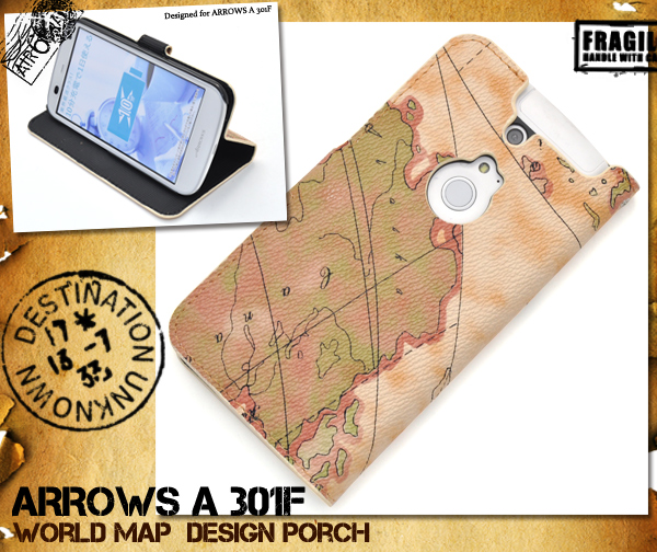 レトロな世界地図デザインがオシャレな、ARROWS A 301F用ケースポーチ!