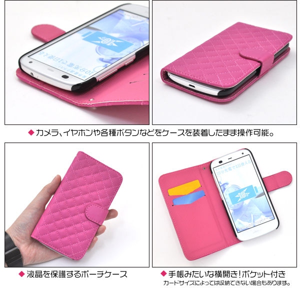 触り心地抜群のキルティングレザーを使用したオシャレなケースポーチです。 内部に備えられたプラスチックケースでしっかり固定し、 衝撃やキズ、埃などからARROWS A 301Fをしっかりと守ります。 背面を折り返すとスタンドとして使用できるので、動画視聴に便利です。 ポーチの内側にはポケットが付いているので、カード類を入れるのに便利! ケースを装着したまま、充電やヘッドフォンジャックの接続、カメラや各種ボタンの操作も可能です。 ブラック、ビビットピンク、ホワイトの3色からお選びください。 ※ARROWS A 301Fは付属しません。ライセンス商品ではありません。 ※ケースをつけたまま撮影できますが、フラッシュ撮影時にケースの色が移り込むことがあります。 |