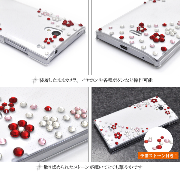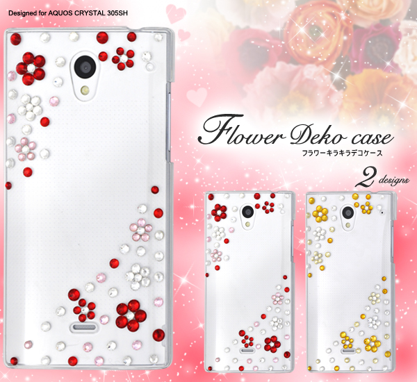 ストーンで配置されたお花が輝く、華やかなデコケースです。 もちろん、衝撃やキズ、埃などからAQUOS CRYSTAL 305SHをしっかりと守ります。 カメラ、イヤホンや各種ボタンなどをケースに入れたまま操作可能です。 ラインストーンが取れてしまった時に便利な、予備ストーン付きです。 2種類のデザインからお選びいただけます。 |