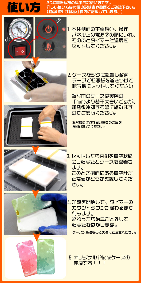 熱と圧力でインクをケースに定着させる昇華転写は、 摩擦に強く色落ちしにくい転写方法です。 しかも平面だけでなく側面への印刷も可能です! |