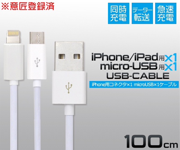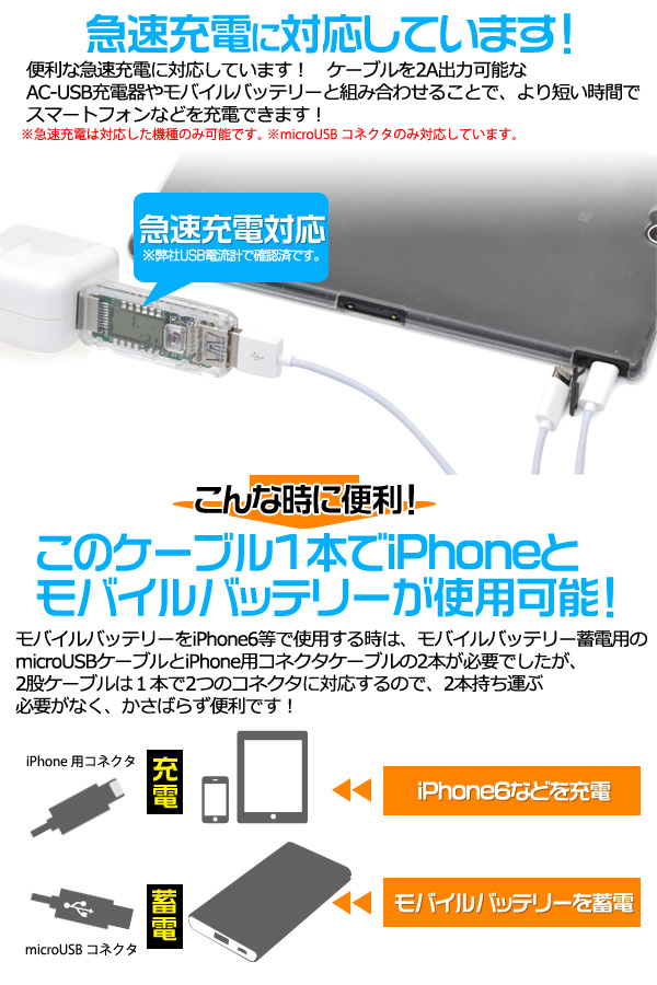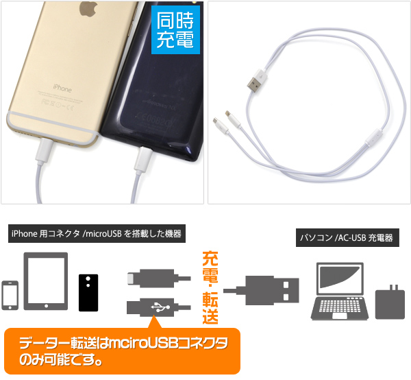 急速充電&同時充電も可能な iPhone用コネクタ/microUSB二股ケーブル 100cm