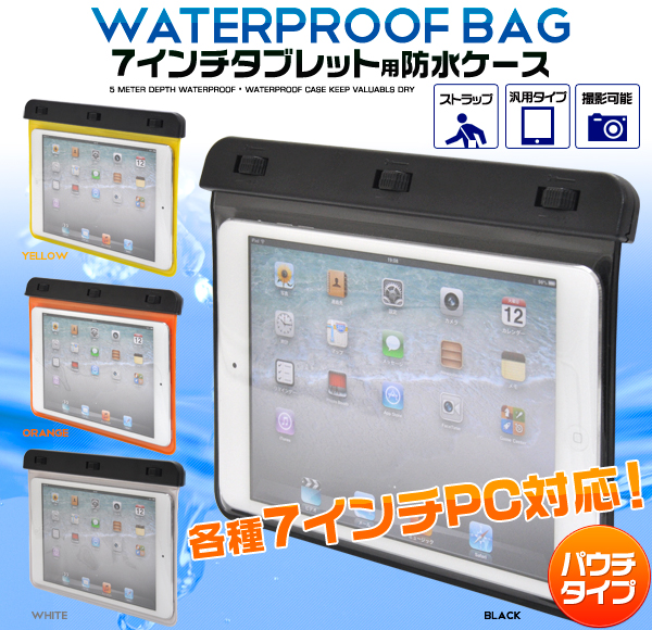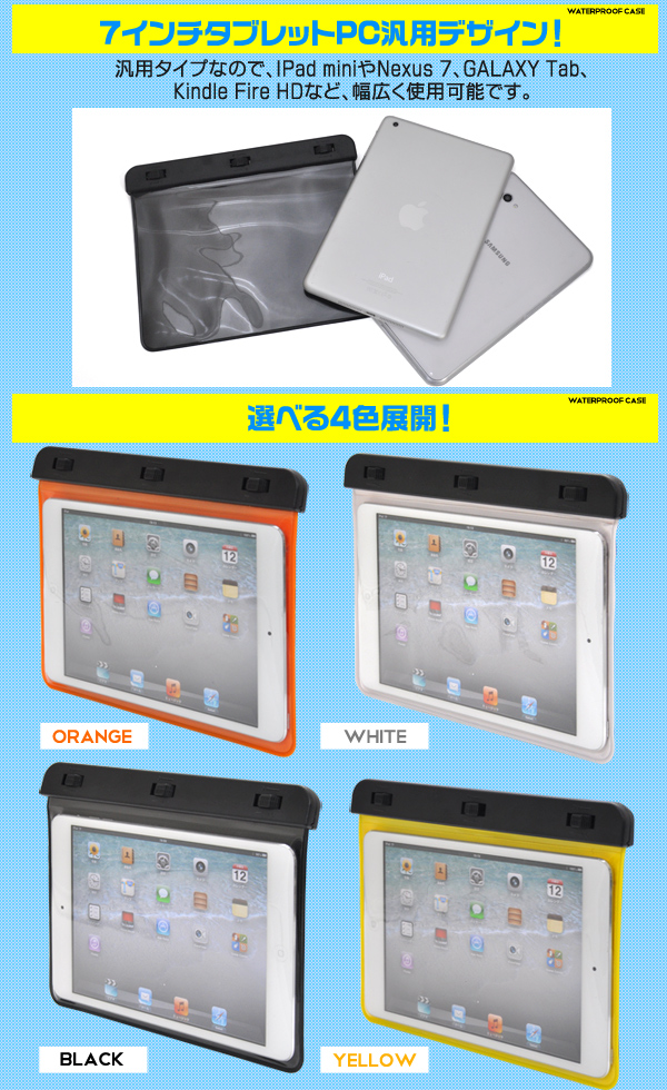| ■防水加工の7インチタブレットPC用ケース! 海水浴やお風呂に便利な、7インチタブレットPC用防水カラーケース! ■幅広い7インチタブレットPCで使用可能! 汎用タイプなので、Nexus 7、GALAXY Tab、 Kindle Fire HDなど、幅広く使用可能!少し大きめなiPad miniにも使用できます! ■静止画・動画の撮影可能! 裏面の左上に透明のカメラ窓がついているので、雨や水・砂の浸入を恐れず、海やプールで静止画・動画を撮影可能!! ※左上にカメラがある機種のみ。 iPadmini撮影可能(確認済み) ■ケースにいれたまま操作可能! ケースに収納したまま、タッチ・ホイール操作がスムーズに行なえます。 ■野外の持ち運びに便利なストラップ付き! 野外の持ち運びに便利なストラップ付き! 登山やマリンスポーツ・ウィンタースポーツ・ウォーキングに最適です。※イヤホンジャック穴は開いていません。 ■4色展開! オレンジ・イエロー・ホワイト・ブラックの4色展開です。 |