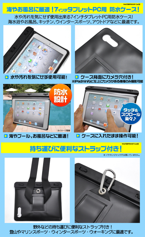 | 注意 | ※ご使用前にケース内にテッシュなどをいれ、密閉した状態で水に浸けるなどして、内部の防水を確認してください。 ※タブレットPCによってはカメラ位置が違うため、写真がうまく撮れない場合があります。 ※カメラ穴は透明ですが、撮影した写真や動画の品質が低下する場合があります。 ※音楽を聴いたり電話を掛けた場合は、音が小さくなりこもった様な音になります。 ※タブレットPCは付属しません。 ※保護ケースを付けたまだと、防水ケースに入らない場合があります。(iPadminiなど) |