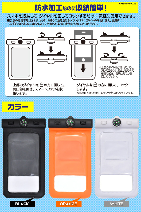■使用前にケースの防水を必ず確認してください。■使用前に必ずケースの開口部のラバーをダイヤルで閉じてください。 ■撮影する場合は、スマートフォンを逆向きでいれてください。■用途以外で使用しないでください。 ■部品のガタつきやゆがみ・曲がり・ケースの破れなど異常がある場合は使用しないでください。 ■本製品を分解・修理・加工・改造はしないでください。■高温多湿の場所や、埃が多い場所で保管しないでください。 ■お子様には本製品や付属品を触れさせないでください。■本製品のお手入れをする場合には、ベンジンやシンナーなどの揮発性有機溶剤が含まれているものは使用しないでください。■本製品の故障、またはその使用によって生じた直接、間接の損害については弊社はその責を負わないものとします。あらかじめご了承ください。■仕様は予告なく変更する事がありますので、あらかじめご了承ください。■本製品を持って飛び込みや潜水、クロール、バタフライなどはしないでください。■音楽を聴いたり電話を掛けた場合は、音が小さくなり、こもった様な音になります。■スマートフォンによってはカメラ位置が違うため、写真がうまく撮れない場合があります。
