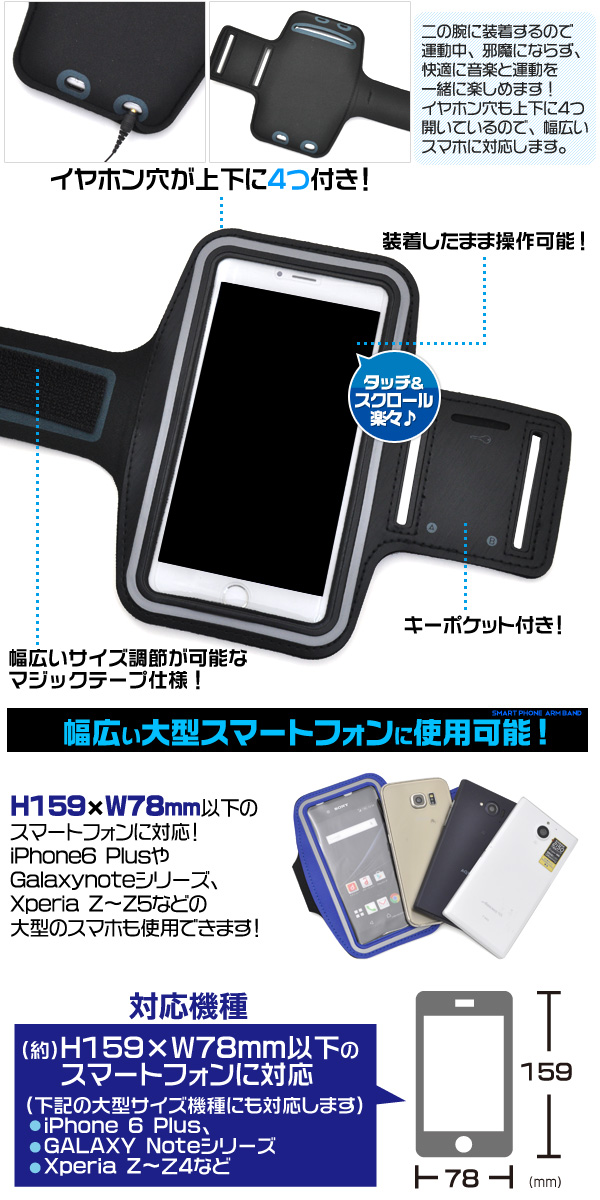 H159×W78mm以下の スマートフォンに対応!iPhone6 PlusやGalaxy noteシリーズ、Xperia Z〜Z5などの大型のスマホも使用できます!