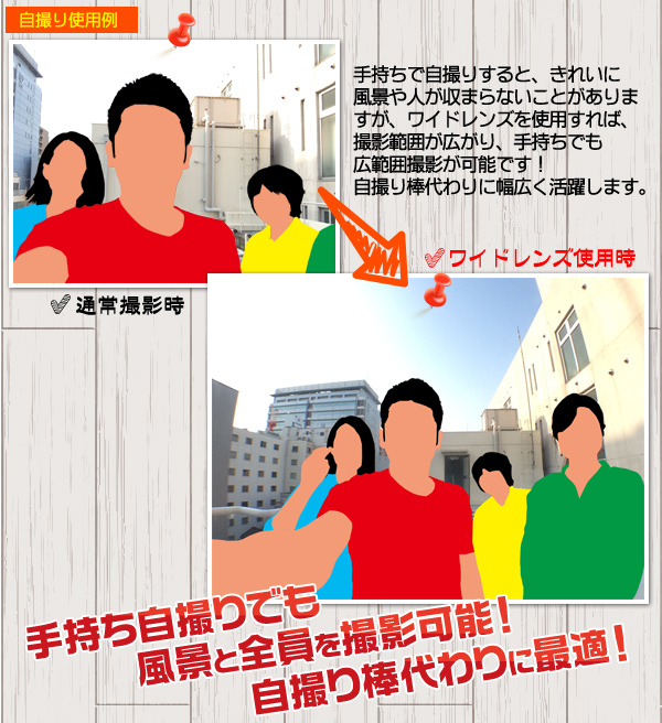 手持ちで自撮りすると、きれいに風景や人が収まらないことがありますが、ワイドレンズを使用すれば、 撮影範囲が広がり、手持ちでも広範囲撮影が可能です! 自撮り棒代わりに幅広く活躍します。