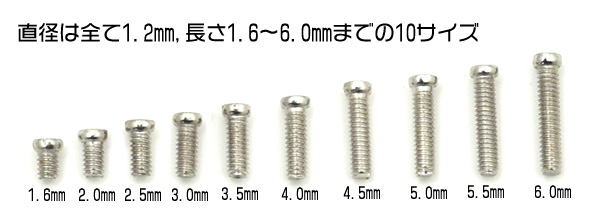 直径1.2mm 長さ1.6mm〜6mmの10種類のステンレス製のネジです。