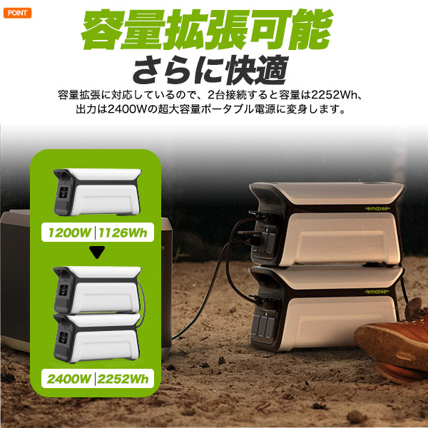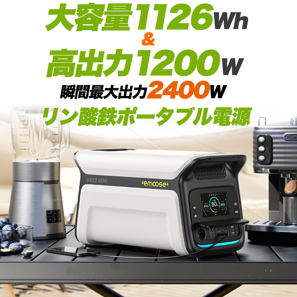 アウトドアや防災用に大活躍! 大容量1126Wh/高出力1200W(瞬間最大出力2400W) リン酸鉄リチウムイオンポータブル電源 |
