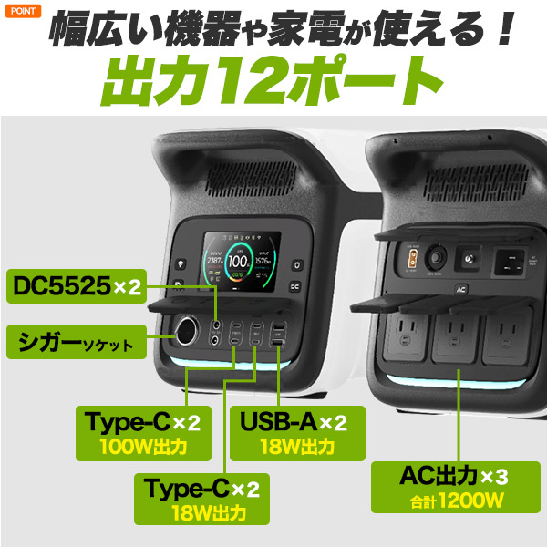| DC出力 | Type-C 1/2:各100W(合計200W) Type-C 3/4 USB-A 1/2 :各18W(合計60W) DC5525 1/2 :各13.3V 8A(最大) シガーソケット:13.3V 10A(最大) |