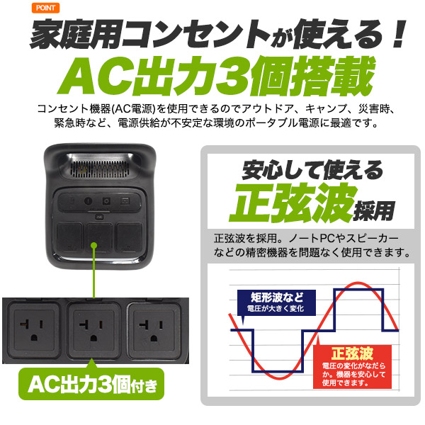 | AC出力 | 各100V 50Hz/60Hz 合計出力1200W 瞬間最大2400W |