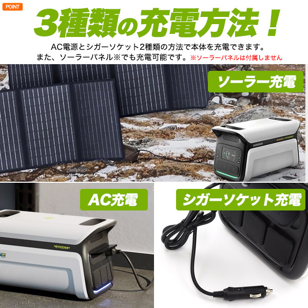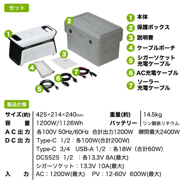 | セット内容 | 本体/保護ボックス/説明書(日本語付き)/ケーブルポーチ シガーソケット充電ケーブル/AC充電ケーブル/ソーラー充電ケーブル |
