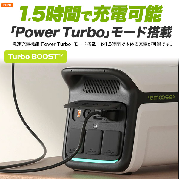 | 充電時間(約) | AC:1.5時間(ターボモード) 3.5時間(エコモード) シガーソケット:16時間 ソーラーパネル:3時間(600Wソーラーパネル使用) |