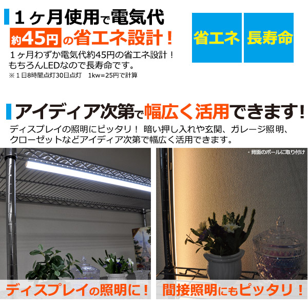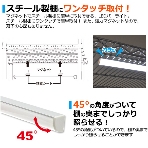 | ▼マグネットでスチール製棚にワンタッチ取付!LEDバーライト 55cm(60cm棚用) マグネットでスチール製棚に簡単に取付できるLEDバーライト。 スチール製棚にワンタッチで簡単取付! また、強力マグネットなので、 落下の心配もありません。 ▼45°の角度がついて 棚の奥までしっかり 照らせる! 45°の角度がついているので、棚の奥まで しっかり照らせることができます。 ▼紫外線をほとんど 放出しないため、 照射物を傷めません。 紫外線や赤外線を含まず、熱も少ないLEDライトの光は、陳列商品(服飾品や宝飾品)や什器にダメージを与えにくく、変色を引き起こしません。 ▼いろいろな棚に取り付け可能! 付属の粘着シートや木製棚用パーツを使用することで、スチール製棚以外の 様々な棚に取り付けることができます。 ▼1ヶ月使用で電気代約45円の省エネ設計! 1ヶ月わずか電気代約45円の省エネ設計! もちろんLEDなので長寿命です。 ※1日8時間点灯30日点灯 1kw=25円で計算 ▼アイディア次第で幅広く活用できます! ディスプレイの照明にピッタリ! 暗い押し入れや玄関、ガレージ照 明、 クローゼットなどアイディア次第で幅広く活用できます。 ▼便利なON/OFFスイッチケーブル付き! 便利なON/OFFスイッチケーブル付きです。 ▼白色と電球色の2色から選べる! ディスプレイの照明にピッタリな白色と、間接照明に最適な電球色の2色からお選びいただけます。 |